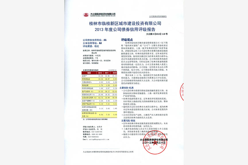 桂林新城投資開發(fā)集團有限公司成立于2009年3月26日,是經(jīng)桂林市人民政府批準(zhǔn)成立的國有獨資有限責(zé)任公司,公司注冊資本9億元。公司以臨桂新區(qū)開發(fā)建設(shè)為主導(dǎo),按照市場配置原則,進行資本運作和投資經(jīng)營,涉及城市基礎(chǔ)設(shè)施建設(shè)、房地產(chǎn)開發(fā)、物資貿(mào)易、廣告?zhèn)髅健⒔逃?、航空、旅游、酒店?jīng)營、政府特許經(jīng)營業(yè)務(wù)等投資領(lǐng)域。擁有全資子公司9家,參股公司8家。