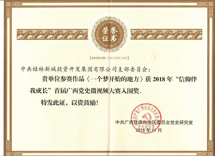 近日,在廣西壯族自治區(qū)黨委黨史研究室、廣西電視臺主辦的“信仰伴我成長”首屆廣西黨史微視頻大賽頒獎儀式上,新城投資集團黨支部選送的參賽作品《臨桂新區(qū) 一個夢開始的地方》榮獲入圍獎。