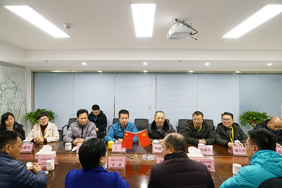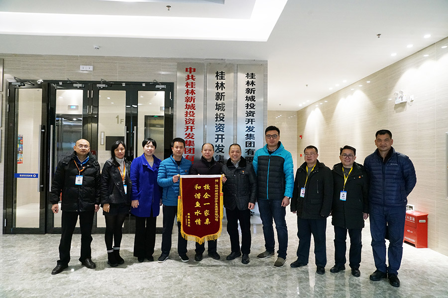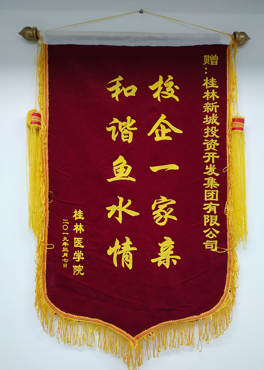 圖為桂林醫(yī)學(xué)院院長助理覃克強(qiáng)一行向新城投資集團(tuán)贈送錦旗