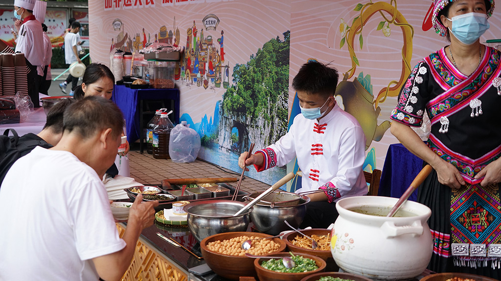 活動(dòng)現(xiàn)場(chǎng),“品非遺美食,游桂林山水”的主題引人入勝,桂林米粉、恭城油茶“非遺”文化展示及品嘗等活動(dòng)精彩紛呈。為確?;顒?dòng)的順利進(jìn)行,宏謀酒管公司迅速組織了20名一線工作者,他們不懼烈日高溫,全心全意地投入到工作中。盡管汗水浸透了他們的衣衫,但他們始終保持著飽滿的熱情和專注,為新生們提供了優(yōu)質(zhì)的服務(wù)。活動(dòng)現(xiàn)場(chǎng)氛圍火爆,總計(jì)供應(yīng)了2000碗米粉以及1500碗油茶,為初來乍到新生和家長們帶來了一場(chǎng)別具特色的美食文化盛宴。