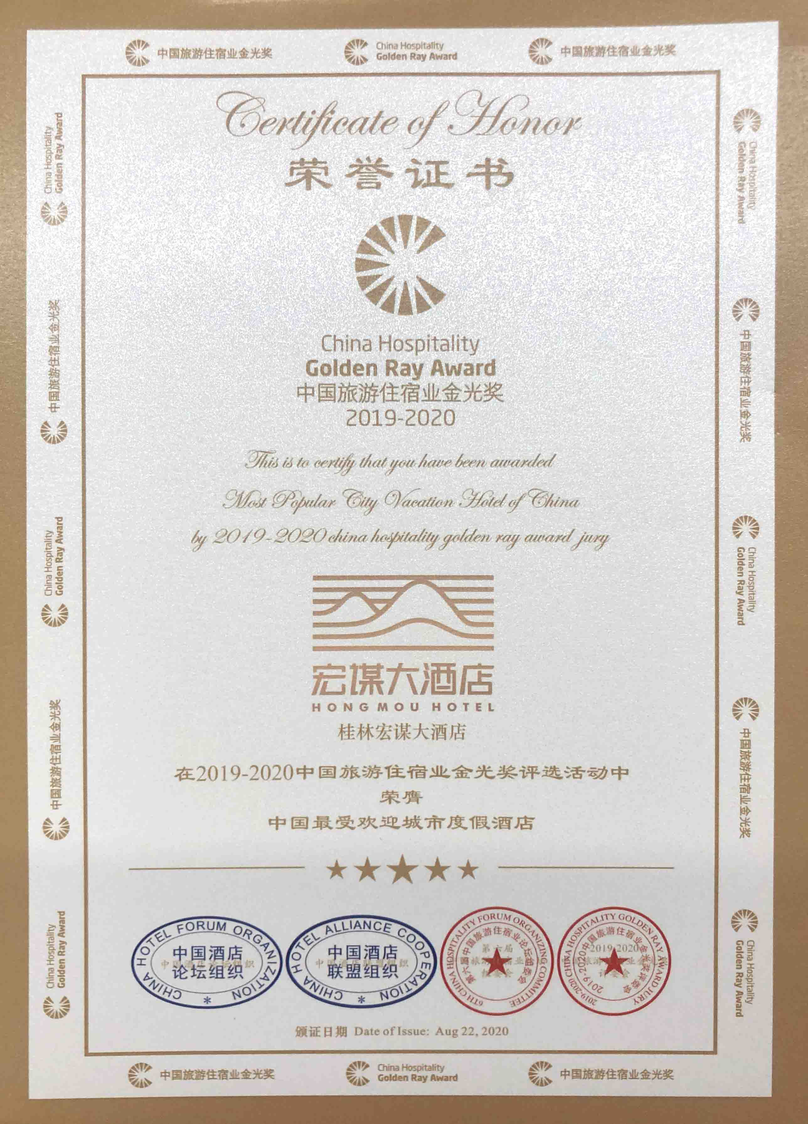 金光獎(jiǎng)是中國旅游住宿行業(yè)跨業(yè)界、跨年度、覆蓋面最廣的獎(jiǎng)項(xiàng),獲獎(jiǎng)評選經(jīng)過各學(xué)術(shù)、專業(yè)、跨界領(lǐng)域評委根據(jù)各酒店競爭力、住房率、收益利潤等多個(gè)標(biāo)準(zhǔn)評選而出。桂林宏謀大酒店此次榮獲中國酒店金光獎(jiǎng)的兩項(xiàng)殊榮,是對酒店不斷深化文化藝術(shù)主題,追求酒店優(yōu)秀服務(wù)品質(zhì)的認(rèn)可!