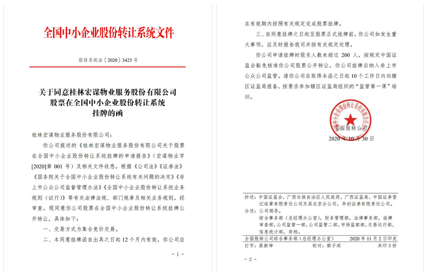 2020年12月9日下午,桂林新城投資開發(fā)集團(tuán)有限公司下屬子公司桂林宏謀物業(yè)服務(wù)股份有限公司在全國中小企業(yè)股份轉(zhuǎn)讓系統(tǒng)即新三板上市。桂林宏謀物業(yè)服務(wù)股份有限公司(股票簡(jiǎn)稱:宏謀物業(yè);股票代碼:873532)成為桂林市第一家在新三板上市的國企物業(yè)公司。