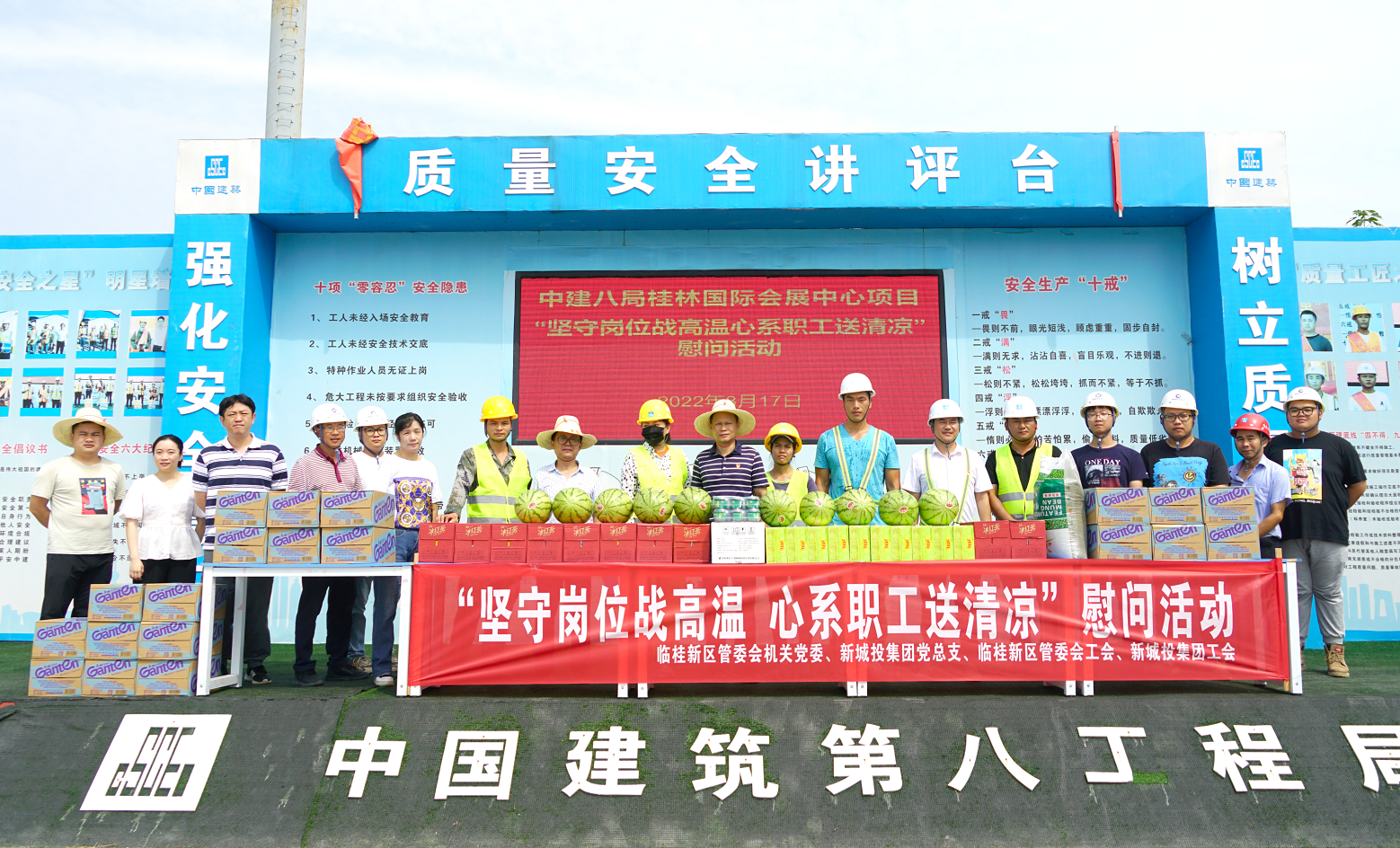 入伏以來,我市驕陽似火,高溫難耐。為切實做好桂林新區(qū)重點項目建設(shè)者的防暑降溫工作,保障建設(shè)者安全度伏,促進重大項目安全生產(chǎn),2022年8月17日,一場由臨桂新區(qū)管委會機關(guān)黨委和新城投集團黨總支主辦,新區(qū)管委會工會和新城投集團工會承辦的“堅守崗位戰(zhàn)高溫,心系職工送清涼”慰問活動依次在北區(qū)湖塘水系連通工程項目、國際會展中心項目、興桂園項目建設(shè)一線開展。