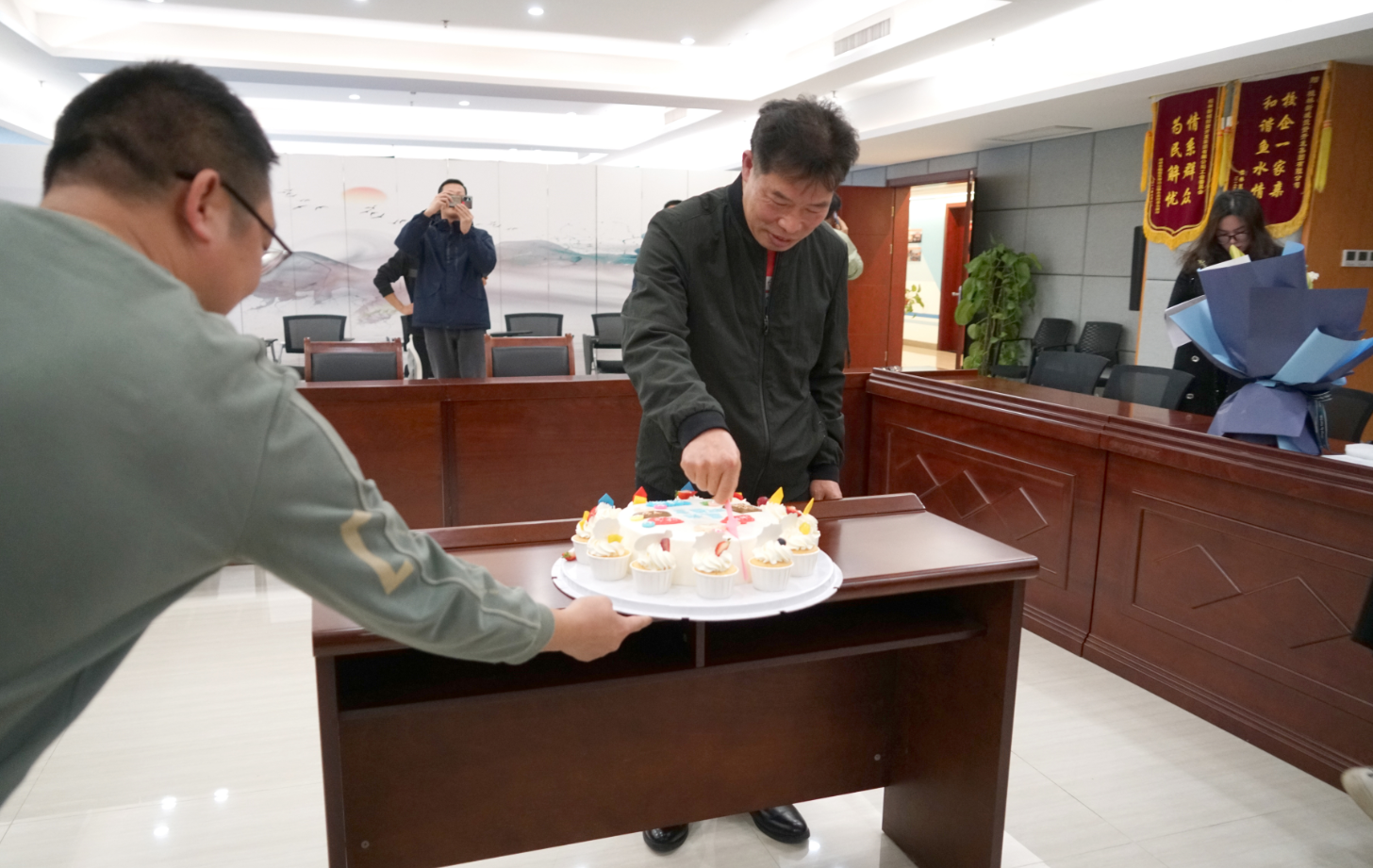 隨后,集團公司領(lǐng)導(dǎo)向陶益方同志贈送退休禮物、相冊及鮮花,切蛋糕并合影留念。