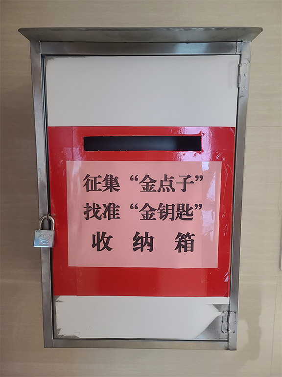 在公司15樓設(shè)置征集“金點(diǎn)子”找準(zhǔn)“金鑰匙”收納箱,直接由總經(jīng)理開取收納箱??偨?jīng)理將根據(jù)方案的可行性安排時(shí)間與提出方案的個(gè)人及團(tuán)隊(duì)見面,聽取方案介紹,探討落實(shí)對策。