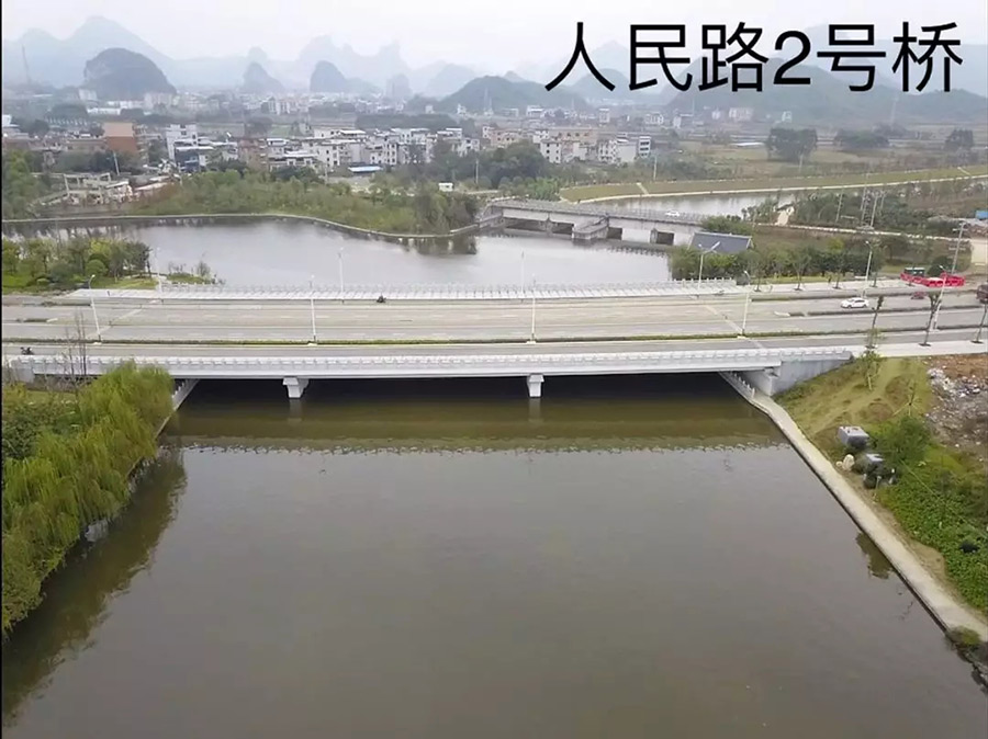 人民路二號橋位于臨桂新區(qū)人民路(萬福路-臨雁路段)上,是臨桂區(qū)通往秧塘工業(yè)園區(qū)的重要通道,橋梁結構采用32米+32米+32米三跨等截面連續(xù)結構,跨越臨桂新區(qū)規(guī)劃水系,橋梁中心線與河道正交,橋梁長度為102.2米、寬度為40米,該工程于2017年5月開工建設,于2018年6月21日完成初步驗收。