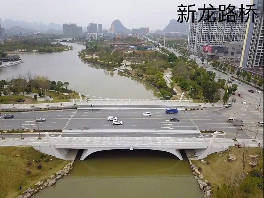 新龍路橋位于臨桂新區(qū)中心區(qū)東部,跨越臨桂新區(qū)沙溏河,橋梁中心線與河道正交,采用單跨斜腿剛構,斜腿剛構跨徑41.282米,主梁總長56米,橋梁總寬47米,分三幅設置,沉降伸縮縫設置在機非隔離帶中間,機動車道部分橋寬25米,每側人行道和非機動車部分橋寬11米,橋梁與河道正交。該工程于2017年1月開工建設,于2018年9月27日完成初步驗收。新龍路橋跨越新區(qū)水系,是連接臨桂新老城區(qū)的重要橋梁,該橋梁使核心區(qū)的交通網絡趨于完善,標志著臨桂新區(qū)核心區(qū)的橋梁工程基本建設完成。
