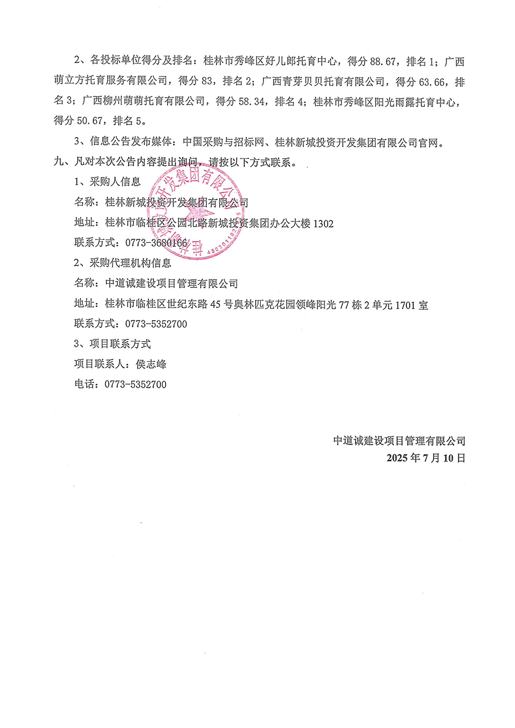 中道誠建設(shè)項目管理有限公司關(guān)于桂林宏謀普惠托育園運營管理項目(重1)(ZDCJS2025-05-001)中標(biāo)(成交)結(jié)果公告